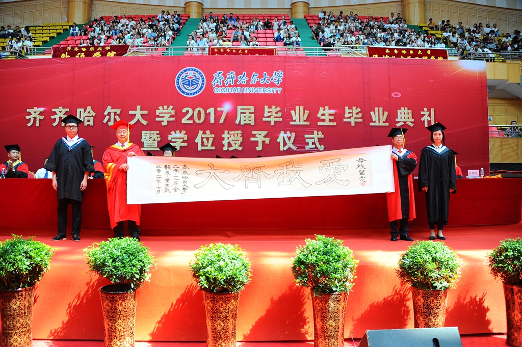 为了表达感恩之情,2017届毕业生同学们也为母校准备了一份精美而充满敬意的礼物,这份礼物是印有“2017届全体毕业生集体印章”的“爱我齐大”纪念画卷。典礼上,毕业生代表向学校赠送“爱我齐大”纪念画卷。校长马立群、校党委副书记盖元臣代表母校接受毕业生赠予的爱心纪念,并表示:“这是同学们热爱母校的见证,母校一定会好好珍藏。”