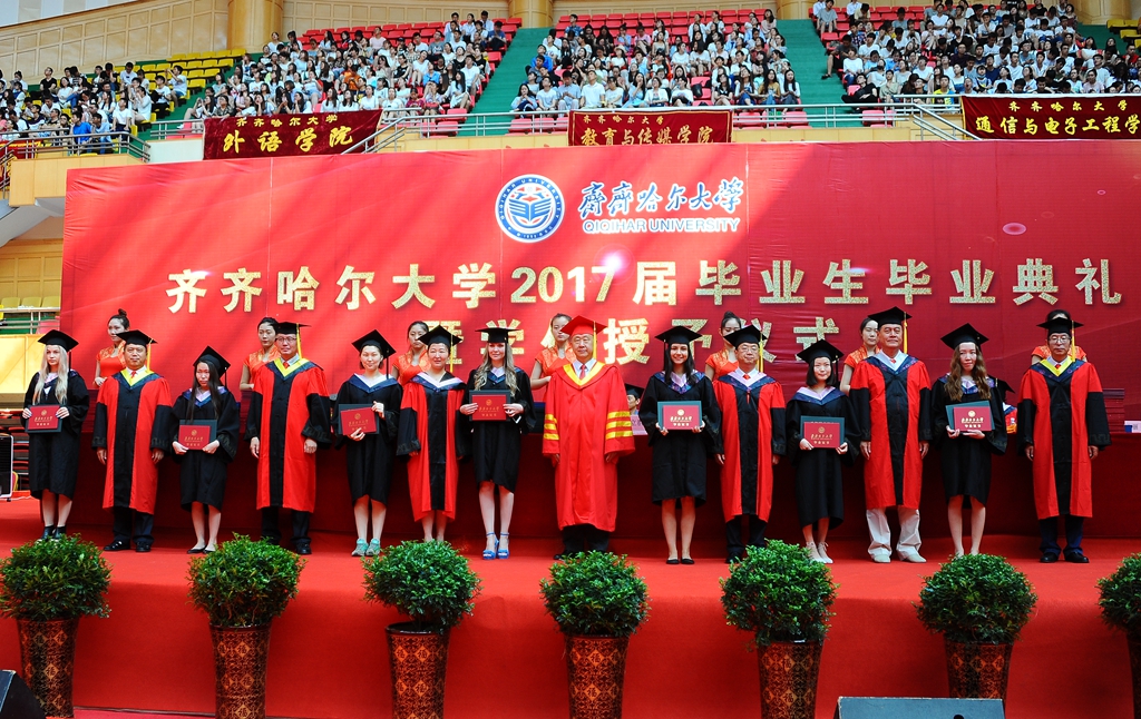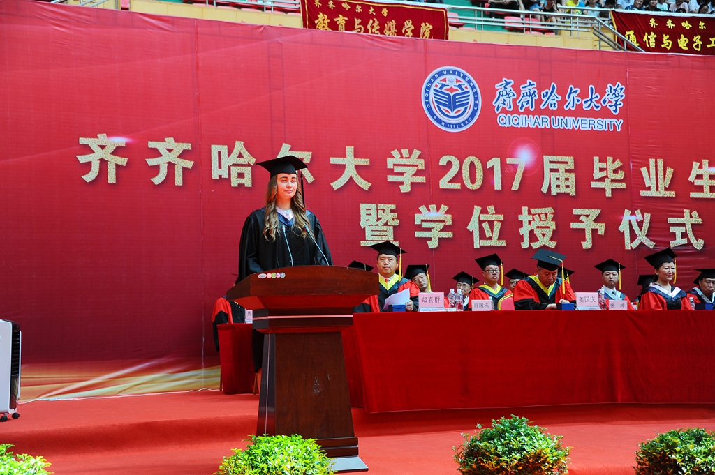 留学生代表、国际教育学院2017届汉语言专业瓦西丽娜同学在发言中表示,四载的青春,齐大见证了她所有的改变,惜别之时,也越发对齐大有无限的眷恋与感恩。她永远不会忘记德润大厦曲折悠长的走廊,永远不会忘记劳动湖夏日盛开的荷花,永远不会忘记扎龙天空飞翔的丹顶鹤。在世界越来越全球化的今天,在经济贸易、国家关系以及文化交流方面,汉语言越来越重要,她相信今天毕业的各位留学生一定会有美好的将来,为世界文化的交流做出自己的贡献。