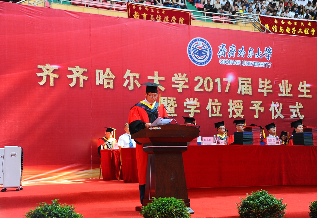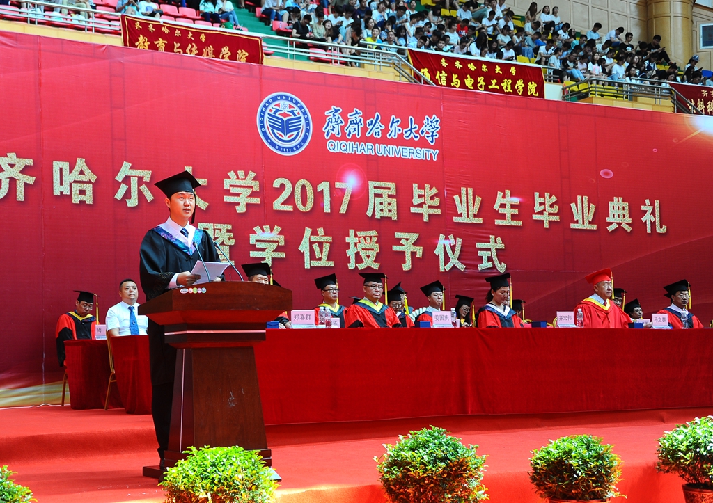 硕士毕业生代表、校研究生会主席、校优秀毕业研究生宋超同学在题为《做祖国和母校满意的好青年》的发言中表示,毕业是一段校园时光的终结,更是一段崭新征程的起点。曾经,在校园中的酸甜苦辣,在科研道路上的摸爬滚打,都将化成养正毓德,精存自生的朴实追求和恒心毅力。这些宝贵的精神财富将伴随我们在未来的人生道路上且歌且行。感恩母校,为我们提供了谱写青春之歌的宽广舞台,教会了我们面对未知人生的奋勇坚强;感恩恩师,以严谨的科研态度、一丝不苟的作风,言传身教,用亲切和宽容陪伴我们一路成长;感谢一起“并肩作战”的研究生同学们,美好的时光里我们互相勉励,灿烂的日子里我们相携前行。感谢大家的陪伴,也祝愿大家前程似锦!祝愿我们友谊长存!无论我们走到哪里,我们的根在齐大。让我们共同祝愿:可敬可爱的老师们桃李芬芳满天下,可歌可赞的齐大梦更加灿烂辉煌!