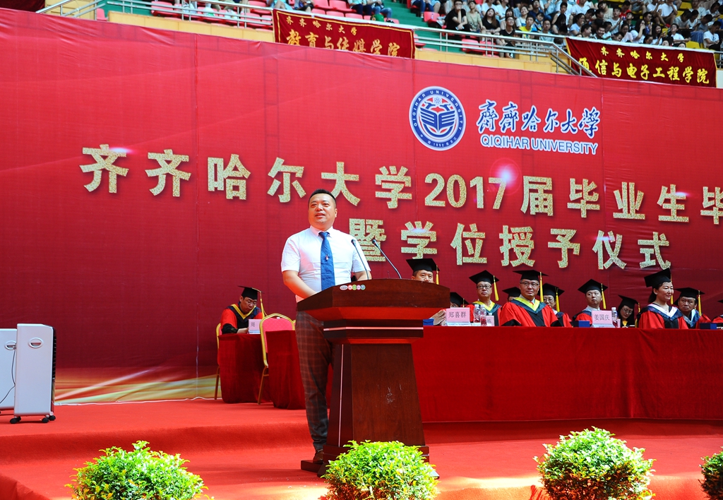 优秀校友、齐大广州校友会会长、元通高科信息化公司董事长刘德权为2017届毕业的师弟师妹送上题为《点亮理想,燃烧生命的责任,让我们做天下的太阳》的临别祝福和毕业赠言,他表示,从1994年毕业到2017年,跨越23年的春夏秋冬,今天他带着所有校友的祝福站在这里,以饱含深情地向母校的校领导、向所有的师长问一声:你们辛苦了!他代表广州校友会对2017届毕业生表示衷心的祝福,恭喜大家圆满地完成了学业,祝愿学弟学妹们前程似锦、万里高飞。他通过自己毕业以来的工作经历来勉励2017届学弟学妹们,要确定好自己的人生目标,要有正确的是非对错观和金钱名利观,要清醒认识、熟悉和驾驭社会规则。