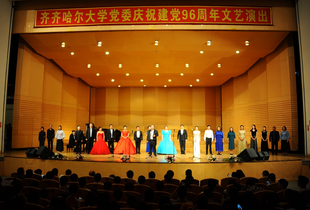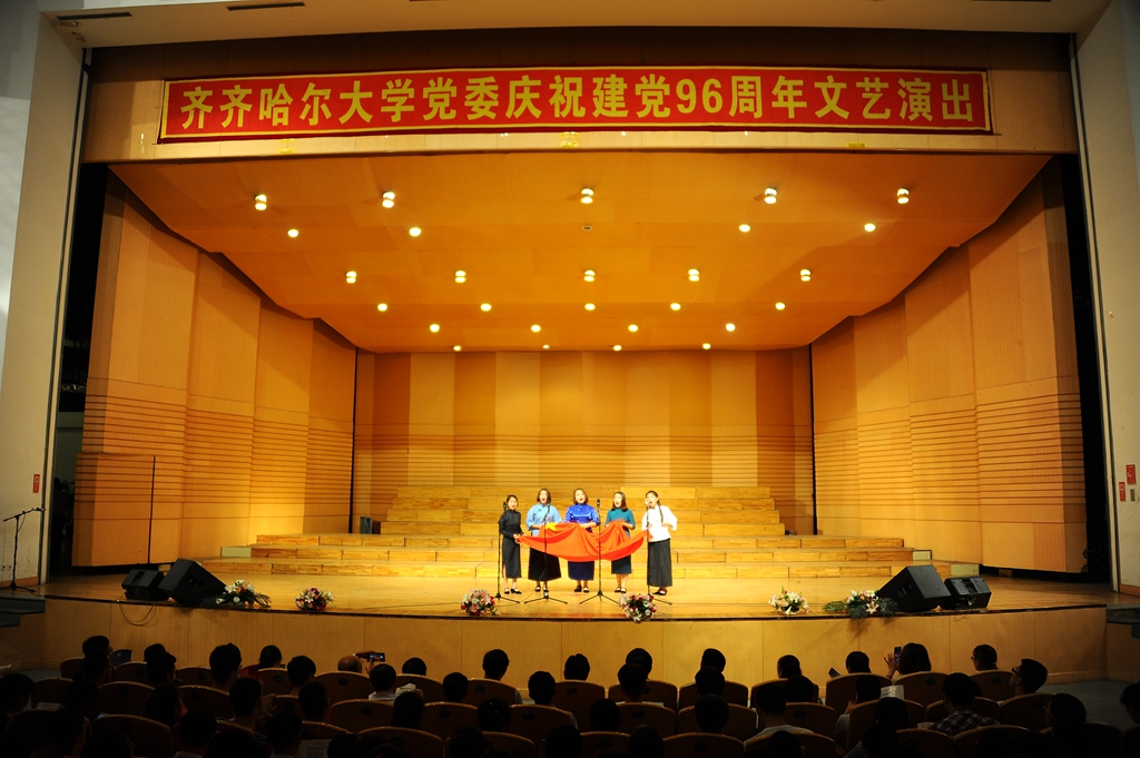 伴随着由音乐与舞蹈学院师生带来的歌剧选段《绣红旗》,庆祝建党96周年文艺汇演拉开了帷幕。男声四重唱《共青团员之歌》用熟悉的旋律瞬间点燃了全场的热情;配乐诗朗诵《黄河之水天上来》,热情歌颂了中国人民坚强不屈的斗争精神,广阔地展现了抗日战争的壮丽图景;群舞《小城雨巷》和《女儿花》用欢快的步伐舞动青春的旋律;男生独唱《把一切献给党》、女生独唱《妈妈教我一支歌》等经典歌曲的演唱,赢得了在场观众的阵阵掌声;唢呐竹笛二重奏《长白山歌》展示了在党的领导下,各族人民心连心、手牵手,军民团结,同呼吸、共命运,共创美好未来的愿景;女声独唱《曙色》、男女声二重唱《阳光路上》、快板《风雨华夏,党谱新篇》、女声独唱《共筑中国梦》等节目,抒发了人民热爱党、歌颂党、祝福党的真挚情感,讴歌了中国共产党人为了祖国和人民出生入死、浴血奋战、开拓进取、甘于奉献的崇高品质,表达了对党无限忠诚、永远跟随党的决心和信心。