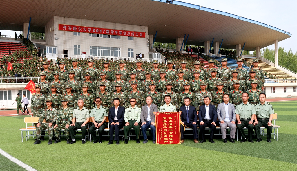 军训总结大会结束后,与会校领导及军训团司、政、后领导成员与武警齐齐哈尔支队官兵合影留念。