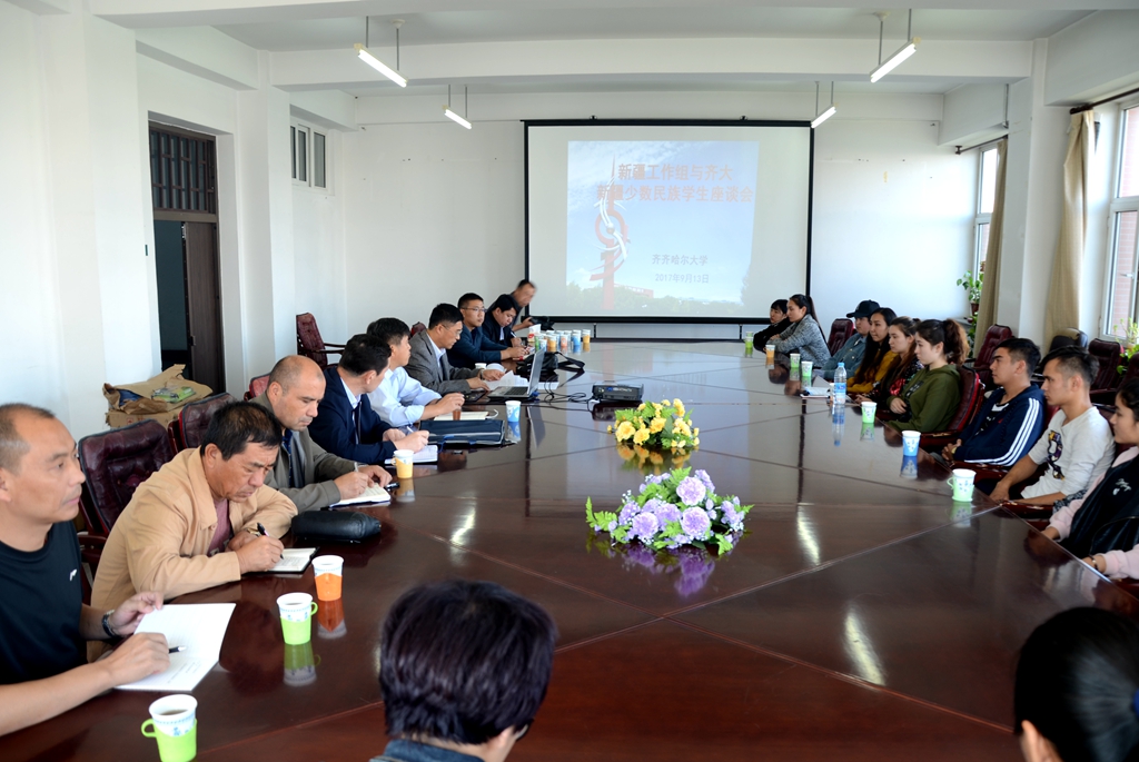 9月13日下午,新疆驻吉林、黑龙江务工经商人员服务管理工作组党委书记叶尔江·朱安汗、副书记霍加艾合麦提·阿不都热依木等一行四人来到beats365调研,看望新疆籍少数民族新同学。常务副校长郑喜群在中区11号教学楼517会议室会见了叶尔江·朱安汗一行,并主持召开座谈会。学生工作部(学生处)部(处)长姜波、副部(处)长张树启,学生教育管理科林浩、新疆籍少数民族学生专职辅导员以及12名2017级新疆籍少数民族学生参加了座谈会。