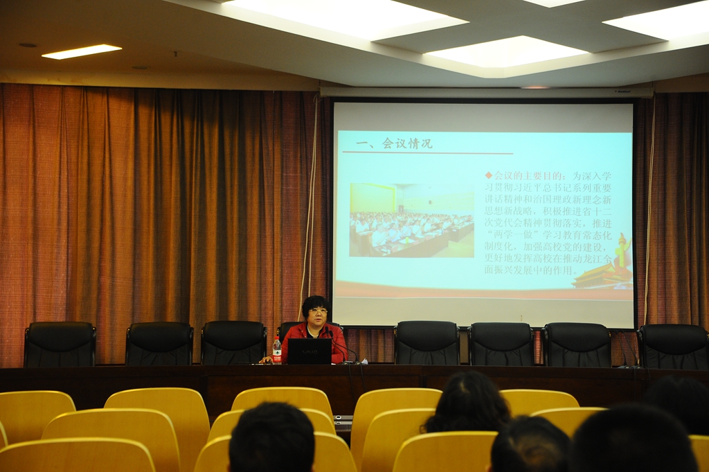 会上,校党委宣传统战部部长王晓梅作了题为《学习张庆伟书记在全省高校暑期书记校长研讨班上的讲话》的报告。她从“强化思想武装,始终保持政治上的坚定自觉”、“认清形势任务,主动融入全面振兴龙江发展大局”、“坚持立德树人,切实加强高校思想政治工作”和“从严管党治党,营造风清气正的高校政治生态”等4个方面,对省委书记张庆伟在全省高校2017年暑期书记校长研讨班上的讲话精神进行了全面、详尽的阐述和解读。