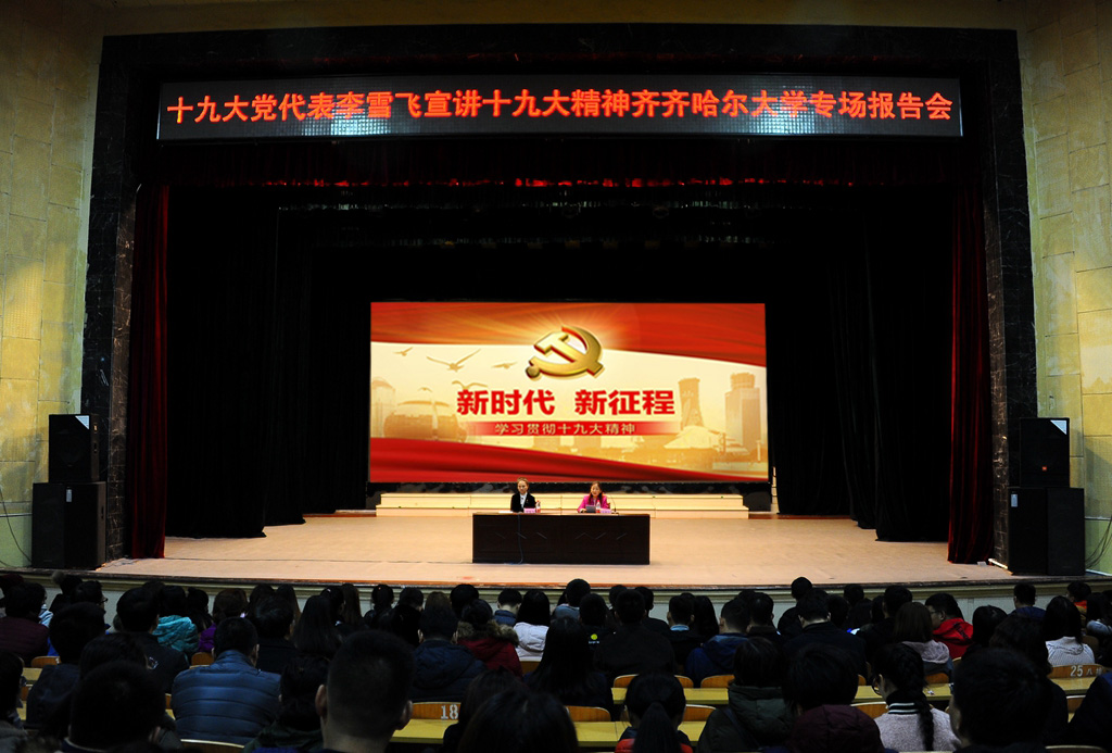 报告会结束后,同学们意犹未尽,李雪飞代表走下讲台来到学生中与广大同学进行了更近距离的交流和互动。她勉励同学们,要深入学习习近平新时代中国特色社会主义思想,努力学习科学文化知识,坚定理想、志存高远、脚踏实地,勇敢肩负起时代赋予的重任,早日成长成才,为实现龙江全面振兴发展贡献力量。来自经济与管理学院的学生党员李玉琪说,我们听了李老师的报告,有身临其境的感觉,对十九大精神有了更深刻的理解,对我们国家的未来更加充满信心,我们一定要更加努力地学习,早日投身到新时代的伟大新征程中去。