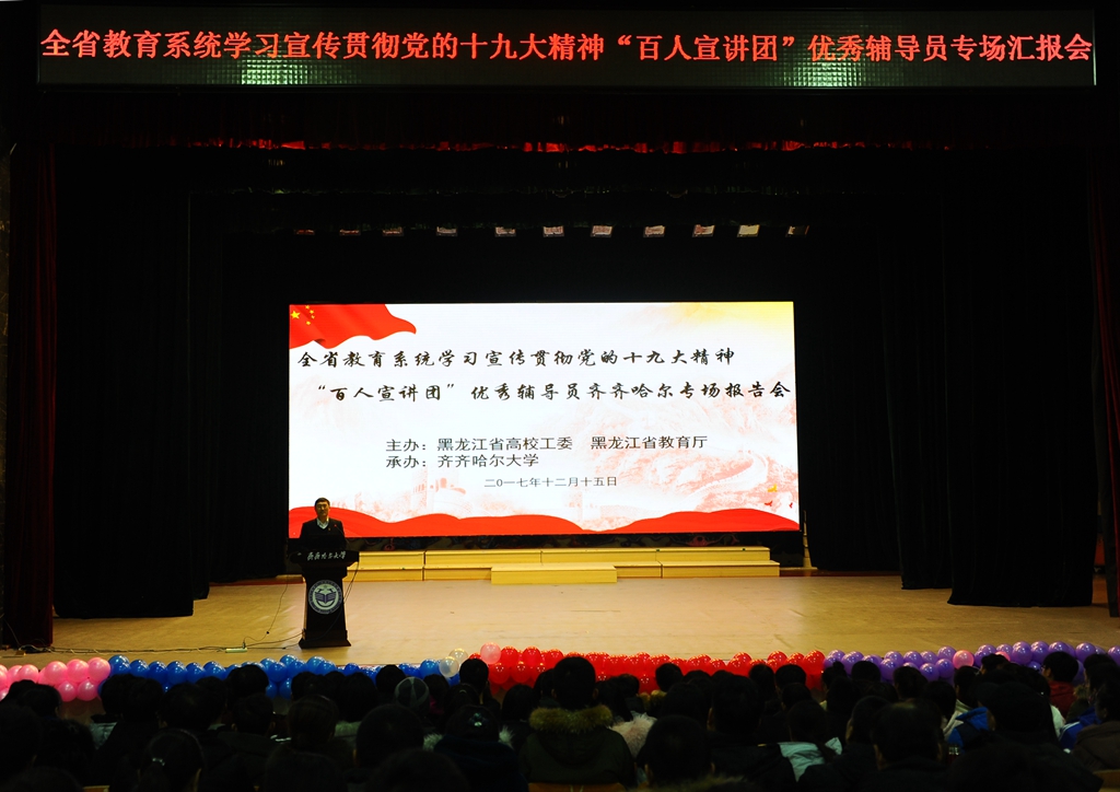 为进一步学习宣传贯彻党的十九大精神,12月15日下午,由黑龙江省委高校工委、省教育厅主办,beats365唯一官方网站承办的全省教育系统“百人宣讲团”优秀辅导员齐齐哈尔高校专场报告会在beats365文化宫举行。beats365各学院主管学生工作的党委书记、副书记副院长、团委书记以及齐齐哈尔市6所高校的辅导员和学生代表近1300人参加了报告会。报告会由校学生工作部(学生处)部(处)长姜波主持。