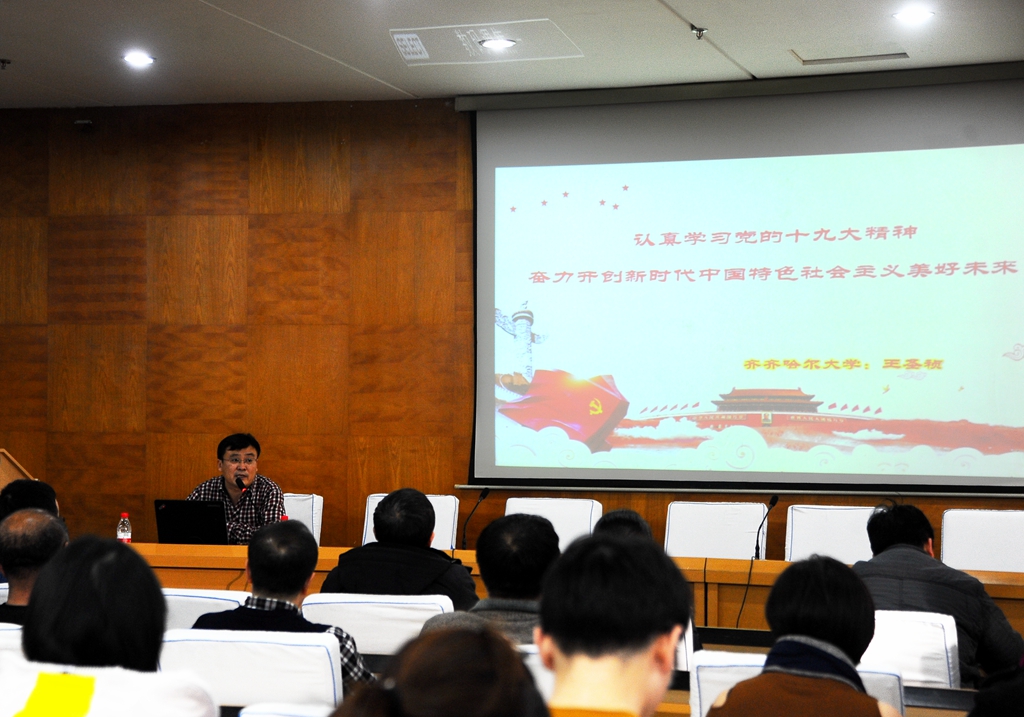 会上,王圣祯教授以《奋力开创新时代中国特色社会主义美好未来》为题,从党的十九大主题和主要成果、中国特色社会主义进入新时代、新时代中国特色社会主义的主要矛盾、新时代中国特色社会主义的历史使命、新时代中国特色社会主义的理论指导、新时代中国特色社会主义的战略目标、新时代中国特色社会主义的战略部署、新时代中国特色社会主义的坚强领导等八个方面,对党的十九大精神进行了系统解读。