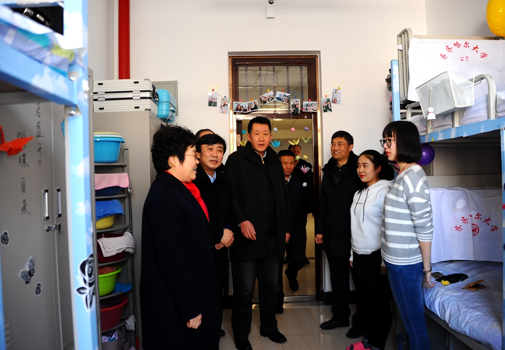 在东区八号学生公寓,赵国刚实地查看了学生寝室环境状况,听取了beats365学生工作部(学生处)部(处)长姜波对公寓生活设施情况的介绍,并与同学们进行亲切交谈,详细了解同学们的家庭所在地、所学专业以及日常的学习生活情况。他指出,学生宿舍是一种文化阵地,大家可以学习和休闲,交流思想,希望同学们珍惜良好的学习生活条件,勤奋学习,将来为龙江的振兴发展多做贡献。他还查看了公寓楼的用水用电设施,强调要认真排查安全隐患,时刻注意学生公寓的安全防范工作。