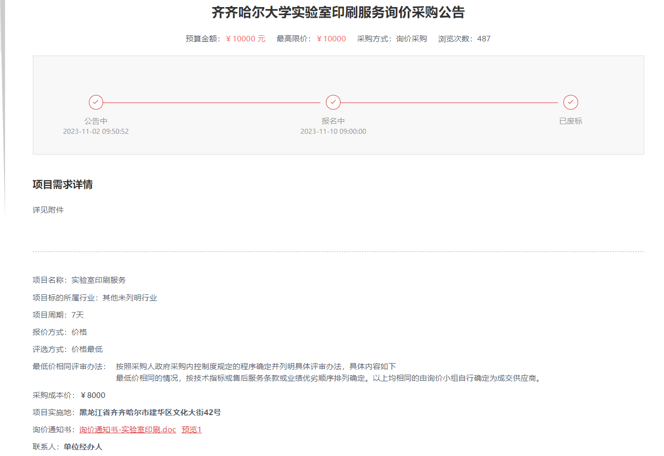 上一条:beats365唯一官方网站实验室印刷服务(第2次)询价采购公告(转自黑龙江省政府采购网)