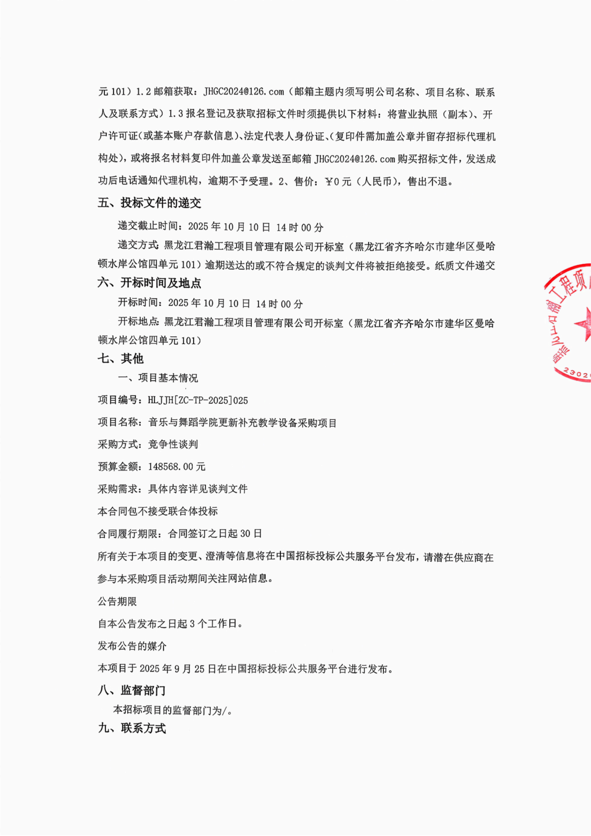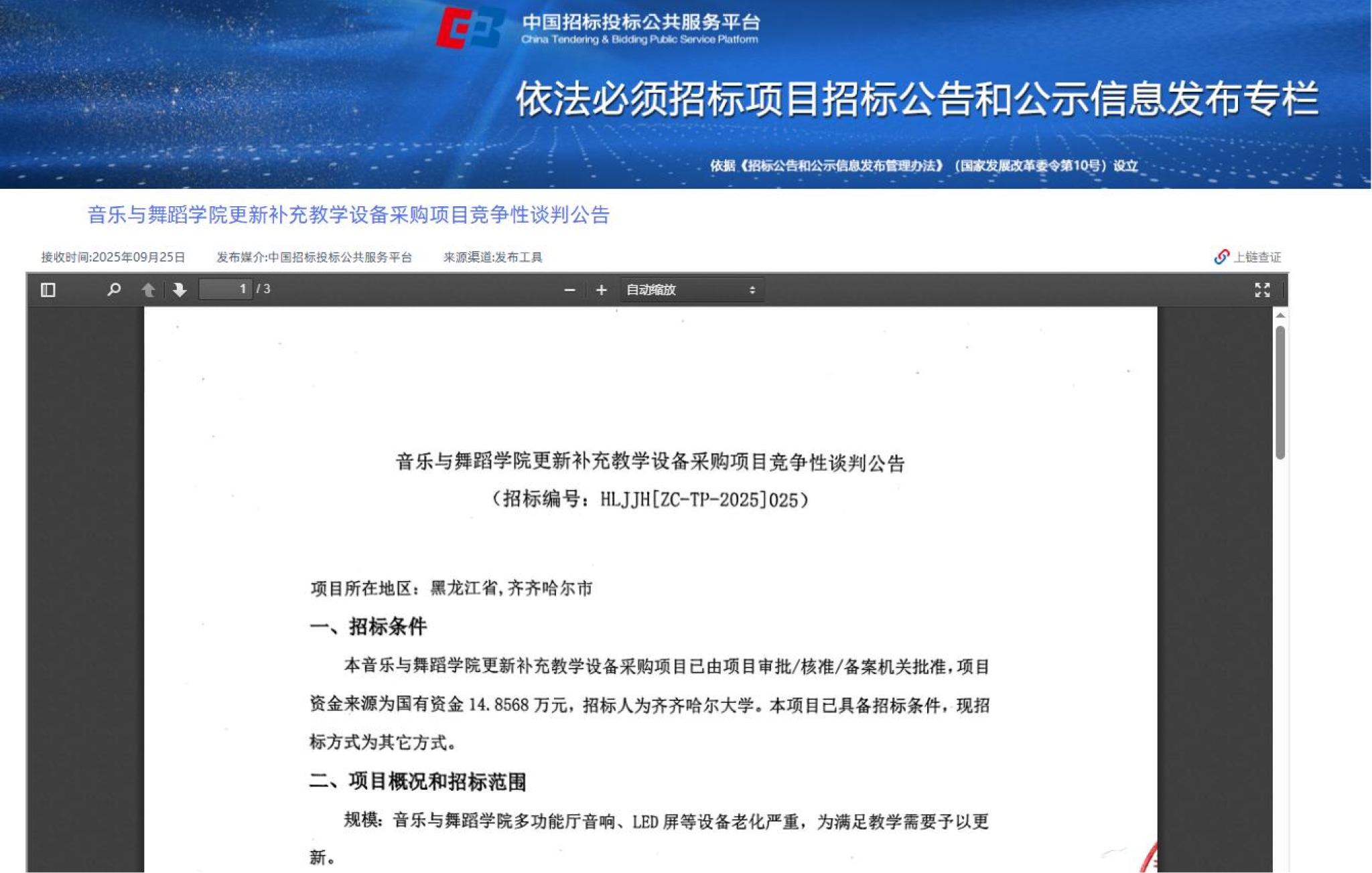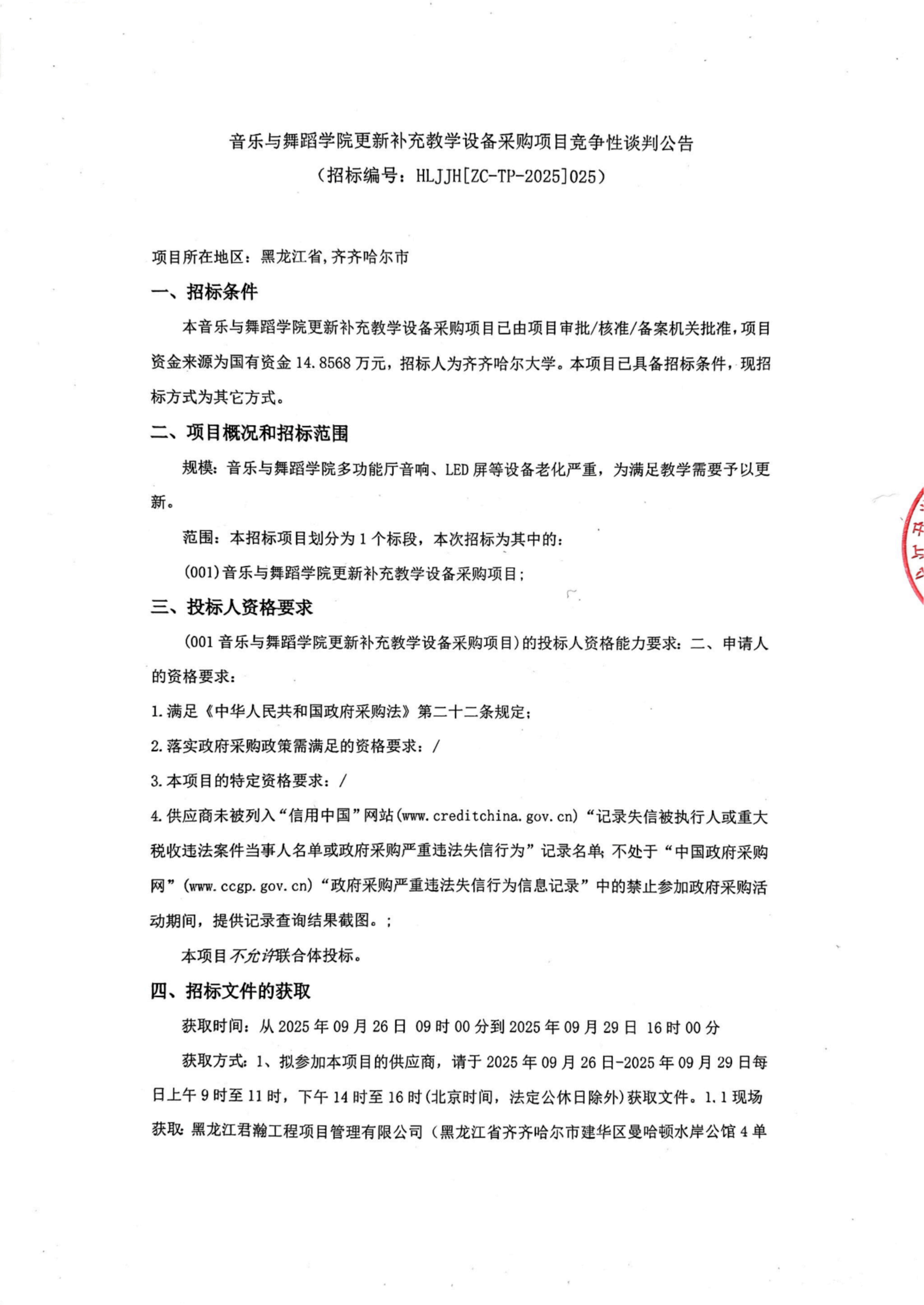音乐与舞蹈学院更新补充教学设备采购项目竞争性谈判公告(转自中国招标投标公共服务平台)