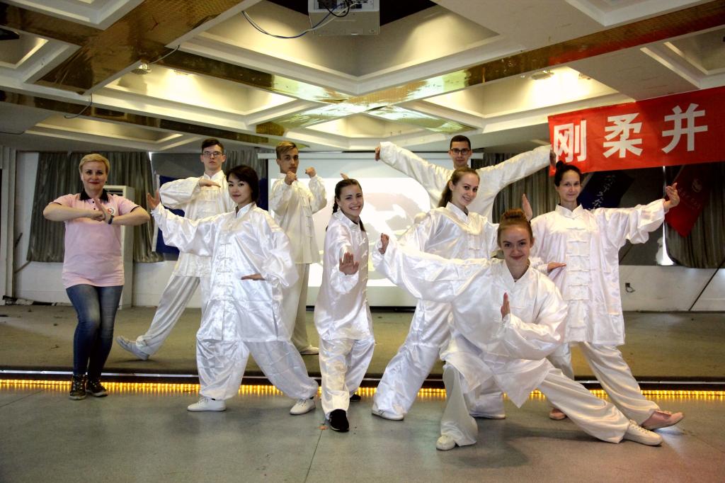 刚柔并济文武道,源远流长中俄情。为了让来访嘉宾近距离感受中华武术的艺术魅力,当天下午,学校在德润大厦318室组织了武术表演和学习活动,来自体育学院的老师刘贝和他的学生们在这里为来访嘉宾现场表演了中华传统武术——太极拳,并现场指导俄罗斯师生学习太极拳法。