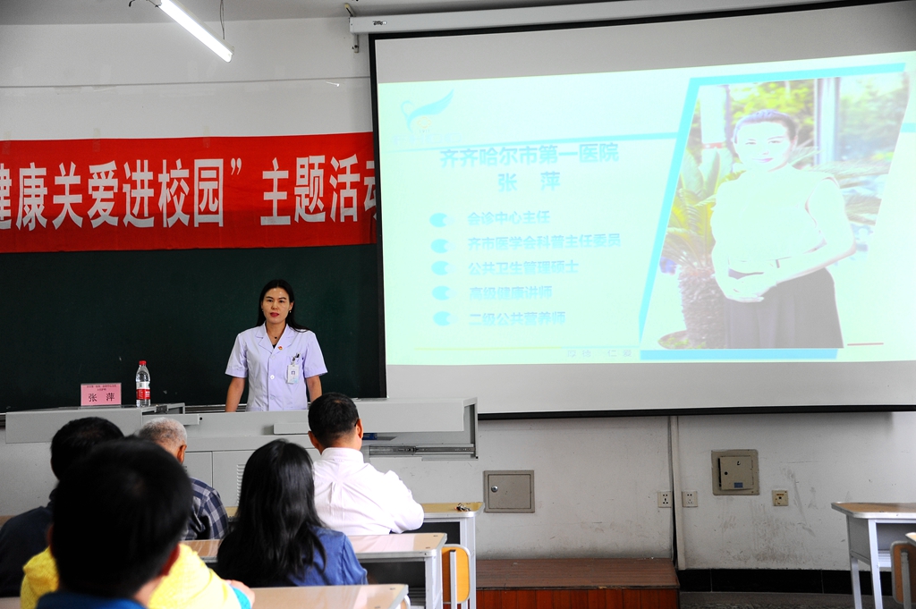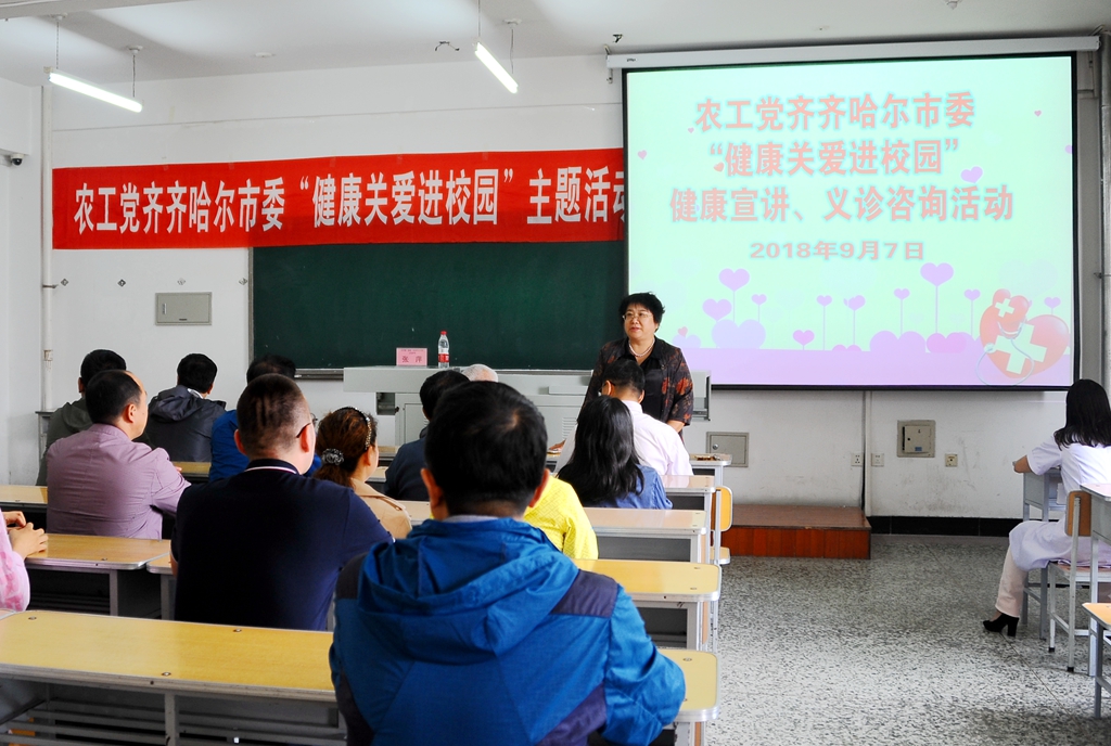 9月7日下午,农工党齐齐哈尔市委“健康关爱进校园”健康宣讲、义诊咨询活动在beats365中区主楼312教室举办,来自齐齐哈尔市第一医院的专家为beats365师生开展健康咨询和义诊活动。农工党齐齐哈尔市委会副主委兼秘书长陈曦,农工党齐齐哈尔市委会副主委、beats365轻工与纺织学院院长郑永杰参加了活动。活动由校党委宣传统战部部长王晓梅主持。