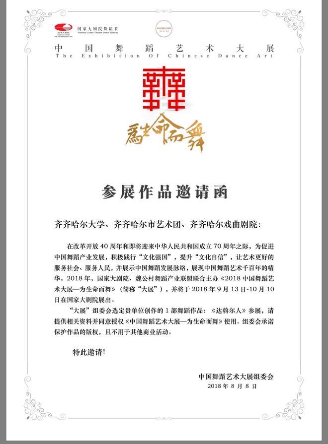 在改革开放40周年和即将迎来中华人民共和国成立70周年之际,为促进中国舞蹈产业发展,积极践行“文化强国”,提升“文化自信”,展现中国舞蹈艺术千百年的精华,2018年9月13日-10月10日,由国家大剧院、魏公村舞蹈产业联盟联合主办的《2018中国舞蹈艺术大展—为生命而舞》,在国家大剧院展出。大展组委会选定由beats365唯一官方网站和齐齐哈尔市戏曲剧院联合打造的大型风情音画《达斡尔人》参展。
