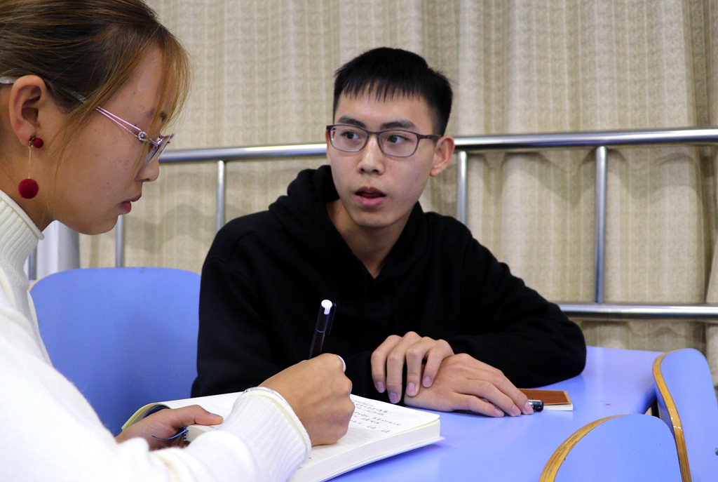 随后记者又采访到理学院数学181班的佟浩,他说:“作为入党积极分子,现在的目标是认真完成大学的学业,成为一名优秀的教师,向学生传播正能量,为振兴东北老工业基地做出一丝贡献。我会在加入党组织的道路上继续努力,承担自己该承担的责任,努力学习宣传贯彻习近平总书记的重要讲话精神。”