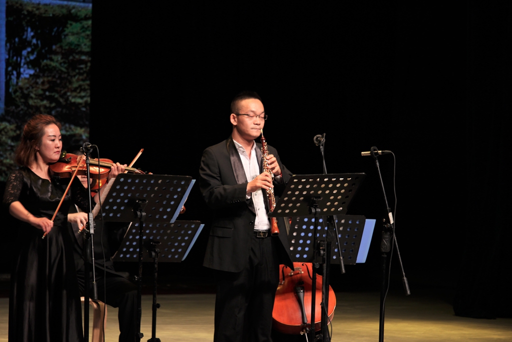 演出十分精彩,一首笛子齐奏《扬鞭催马运粮忙》拉开了本场演出的序幕。笛声时而急促,时而平缓,时而高昂,时而低沉,时而犹如骏马奔驰长河落日般壮观,时而犹如细雨清风潺潺流水般平静,为现场观众们带来了一场听觉盛宴;男声独唱《乌苏里船歌》和《鸿雁》则铿锵有力,充满豪情;一首古筝弹奏曲《边疆泉水清又纯》给大家描绘了一幅浪漫和谐的画面,弹奏者徐婷婷穿着一袭长裙,纤纤十指,带领大家充分领略了古典乐器的魅力。