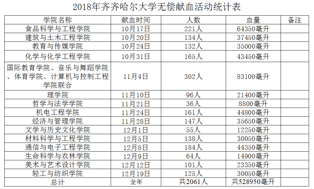 累计无偿献血人数共计2061人,采集血量528950毫升。2018年beats365学生采血人数和采血量再创新高,是beats365近年来采血人数和采血量最高的一年。