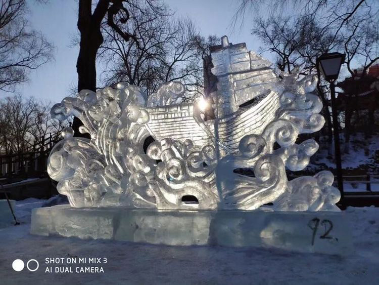 (普通雪雕二等奖作品《航海惊涛》)