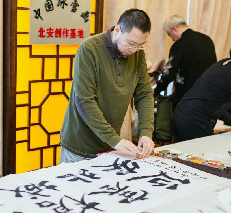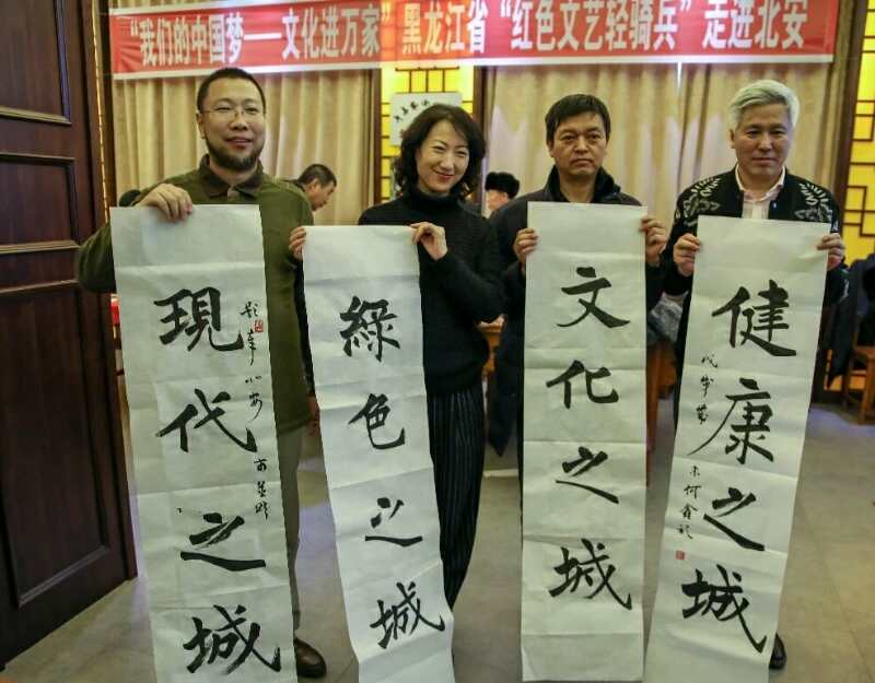 在北安市,小分队成员抵达后,不顾旅途劳顿就立即投入到活动中来。当晚,在北安文化艺术基地举行了文学、美术、书法、摄影笔会,艺术家们挥毫泼墨,满怀激情地绘就了一幅幅充满吉祥福意的书画作品,吸引了当地众多爱好者前来学习交流。大家表示,这样近距离地和来自省城的大艺术家们面对面学习交流,太难得了!