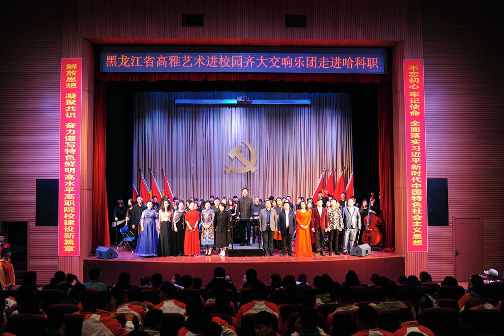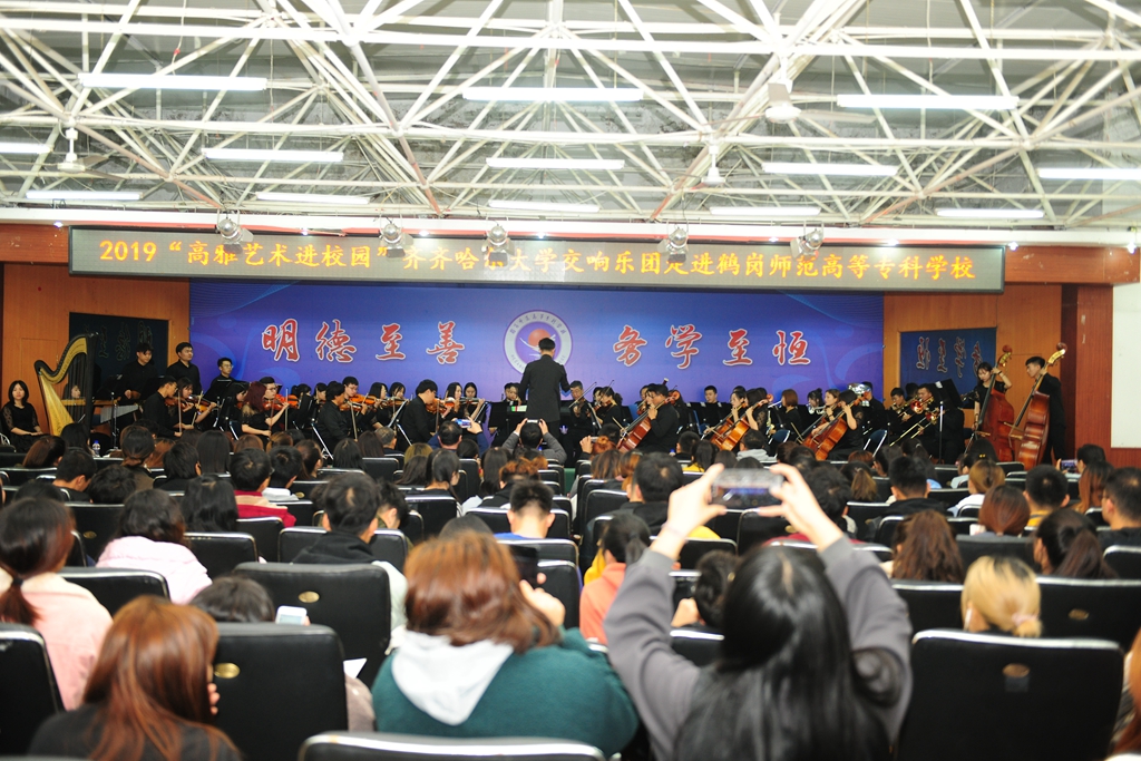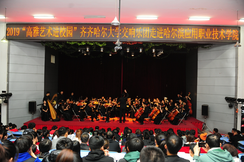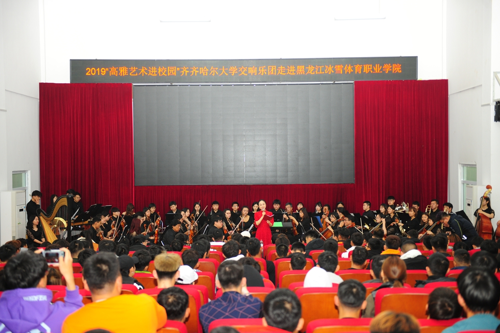 在新中国成立70周年的喜庆日子里,在第二批“不忘初心、牢记使命”主题教育深入开展之际,为传承和弘扬高雅艺术,10月14日至18日,受黑龙江省教育厅、文化和旅游厅、财政厅的委托,校党委宣传部副部长何强、音乐与舞蹈学院副院长殷进良,带领beats365唯一官方网站交响乐团70余名师生,赴鹤岗师范高等专科学校、黑龙江冰雪体育职业学院、哈尔滨应用职业技术学院、哈尔滨科学技术职业学院,开展了四场“高雅艺术进校园”专场演出。