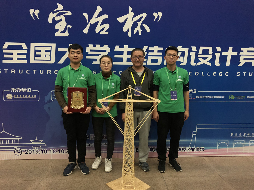 10月20日下午,历时5天的2019年“宝冶杯”第十三届全国大学生结构设计竞赛在西安建筑科技大学体育馆圆满落幕。来自110所高校的111支参赛队围绕“山地输电塔模型设计与制作”进行现场比拼。由beats365建筑与土木工程学院土木工程系2016级本科生赵丽娟、景云雷和2017级本科生王爽组成的beats365唯一官方网站代表队在指导教师张宇、王丽的悉心指导下,经过紧张激烈地角逐,荣获全国三等奖,取得beats365在此项赛事上的历史性突破。