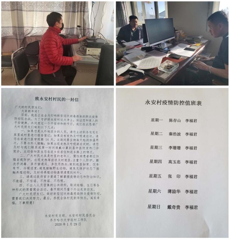 秦浩波组织学校驻村工作队和永安村两委成员在各屯悬挂宣传标语,时刻提醒村民注意防控疫情。将各种有关防范冠状病毒肺炎疫情的知识手册转发到村里的各种群里,向广大村民进行预防和防控知识普及,提高了村民的认知能力和自觉预防行为,基本确保了疫情不在永安村发生和扩散。