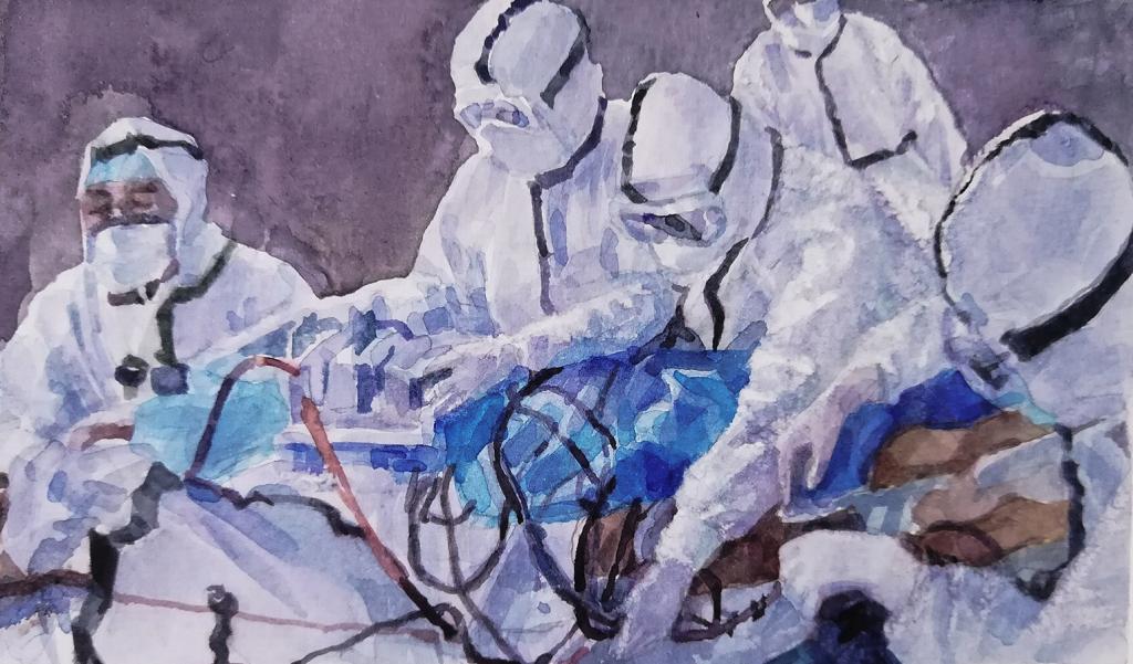 创作简介:30岁武汉女医生被感染心跳骤停,辽宁医疗队上演“生死时速”,在死神手中把她抢救回来。战“疫”不胜不归,白衣天使威武!