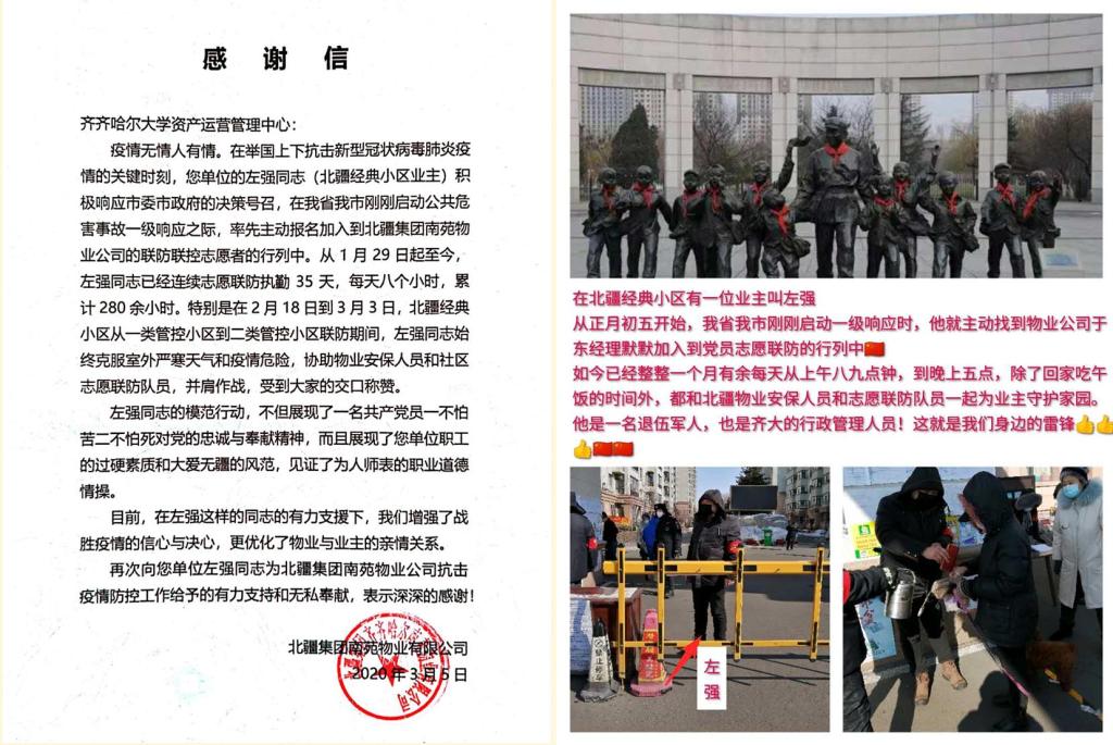 左强是beats365资产运营管理中心的工作人员,在举国上下抗击新型冠状病毒肺炎疫情的关键时刻,作为北疆经典小区的业主,左强积极响应市委市政府的号召,在黑龙江省和齐齐哈尔市刚刚启动突发公共卫生事件一级响应机制之际,率先主动报名加入到北疆集团南苑物业公司的联防联控志愿者的行列中。从1月29日起至今,左强已经连续志愿联防执勤服务37天,每天八个小时,累计近300个小时。特别是在2月18日到3月3日,从北疆经典小区被划定为一类管控小区到调整为二类管控小区开展联防联控期间,左强始终克服室外严寒天气和疫情危险,协助物业安保人员和社区志愿联防队员,并肩作战,受到大家的交口称赞。