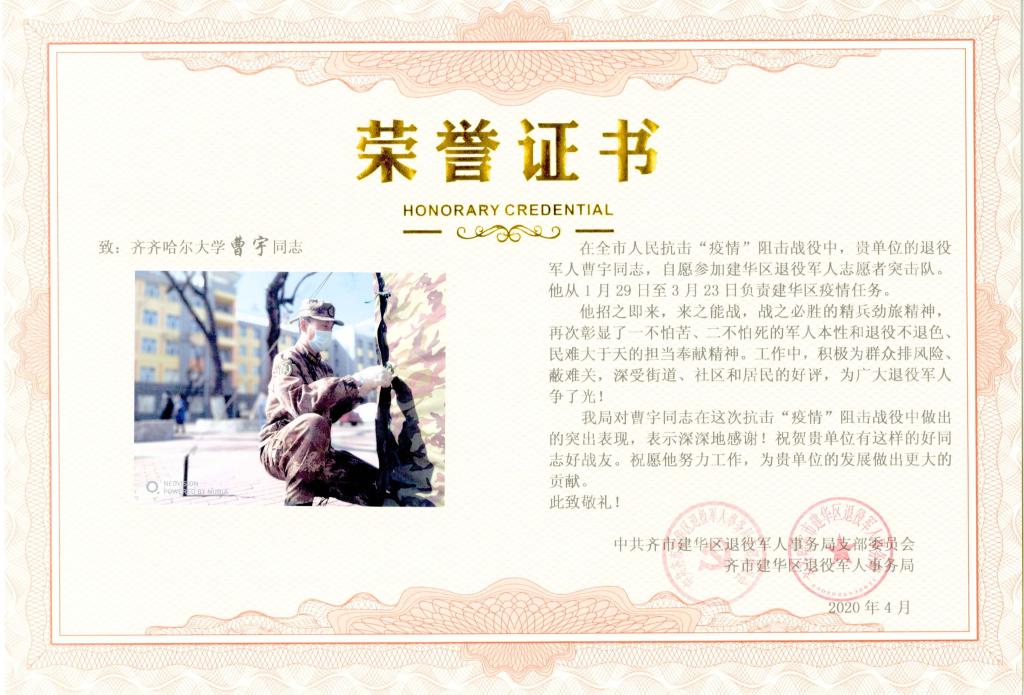 曹宇平日在校时就乐于助人,无私奉献,在国家和人民有难时又挺身而出,攻坚克难,他的事迹也被更多人知晓。鉴于他在此次疫情防控阻击战中的突出表现,中共齐齐哈尔市建华区退役军人事务局支部委员会授予了他优秀志愿者徽章与荣誉证书。他在得知自己获得这份殊荣时说道:“虽然证书上写的是我的名字,但荣誉背后有着更多无名英雄的汗水与努力。作为一名党员,一名接受了高等教育的退伍军人,党和国家培养了我,在危难之际我就应该冲上前去。”