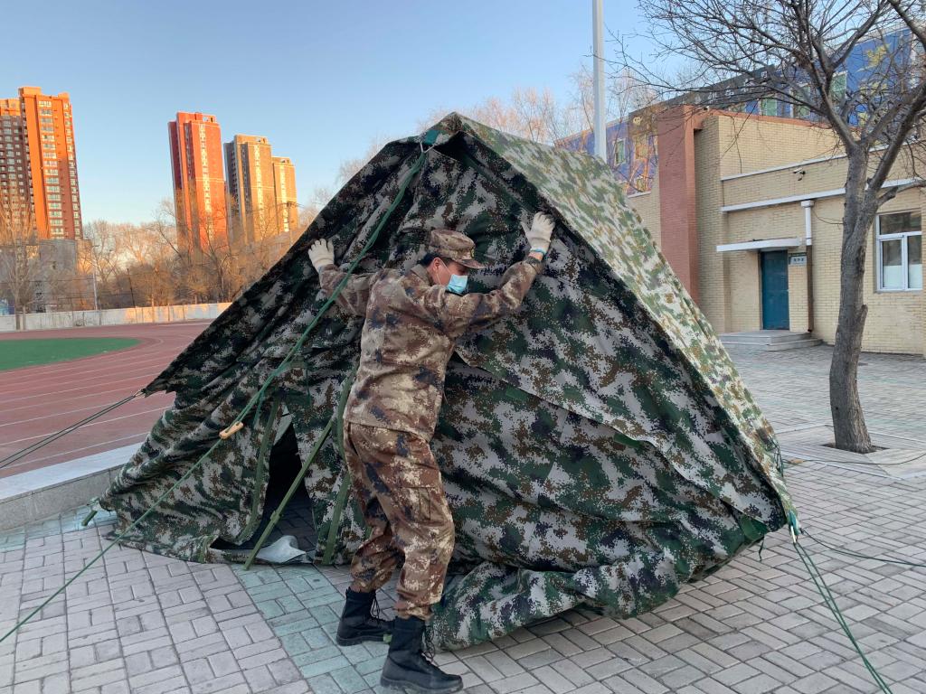 曹宇是齐齐哈尔市建华区民兵应急连的指导员。疫情防控初期,齐齐哈尔市建华区武装部就开始支援地方社区和各路口搭建御寒隔离帐篷。因正处于新年期间,只有曹宇和他的连长两个人奔波到各处指导并共同完成帐篷搭建工作。仅仅两个星期,就组织搭建了40多顶帐篷。疫情愈发严重,曹宇还没来得及歇一歇,就加入了退役军人事务局的老兵们自发组织的退伍老兵突击队,带领大家冲到疫情防控的前线。