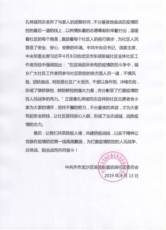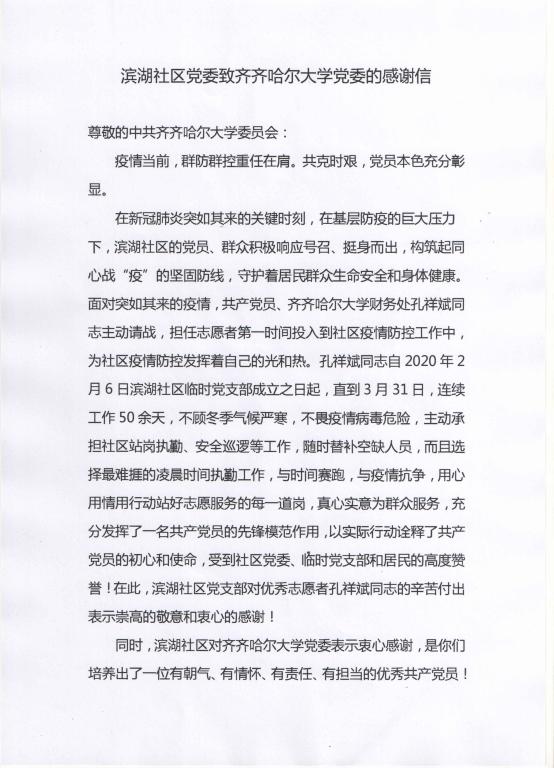在抗击新冠疫情斗争中,beats365广大党员志愿者响应党的号召,积极参加志愿服务工作,财务处孔祥斌同志就是其中一位优秀代表,他的先进事迹被龙沙区滨湖社区专题简报第25期重点报道,被“中国经济新闻联播”和市委市政府的“鹤城发布”微信公众号等媒体上宣传,产生了积极而广泛的社会影响。4月13日,校党委收到齐齐哈尔市龙沙区滨湖社区党委送来的一封感谢信,信中对坚守奋战在滨湖社区抗疫一线近2个月的财务处党员志愿者孔祥斌同志给予赞扬和感谢,对beats365唯一官方网站党委的大力支持和热忱支援致谢。