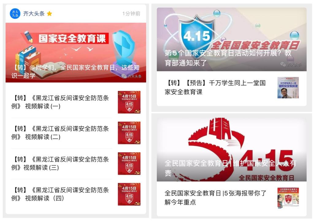 4月10日,党委组织部组织全校副处级以上干部参加了全省国家安全知识网上答题活动,通过网上答题或手机APP答题方式,对“总体国家安全观”及《中华人民共和国国家安全法》《中华人民共和国保密法》等相关应知应会知识进行答题。学校有针对性地组织学生开展了国家安全专题网络学习,号召全校学生参加“千万学生同上一堂国家安全教育课”活动,通过“中国大学生在线”等网络教育平台观看教育部组织录制的由公共安全领域专家、中国工程院院士范维澄为全国大学生讲授的《总体国家安全观视角下的疫情防控》视频公开课。通过学校网课平台播放省国家安全厅专门编辑制作的《国安小剧场之龙江国安讲堂——<黑龙江省反间谍安全防范条例>解读》反间谍安全防范宣传视频,切实增强广大师生维护国家安全的意识和能力。