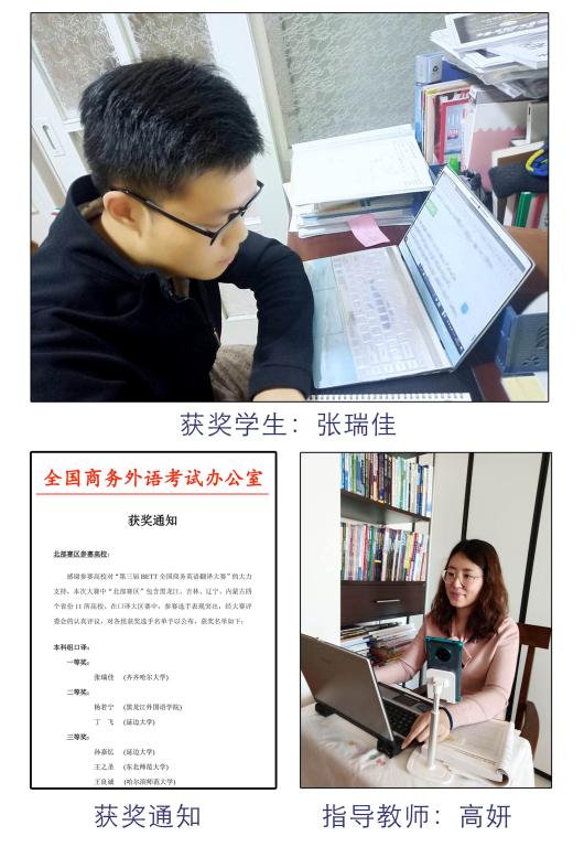据指导老师高妍副教授介绍,早在2020年1月,外国语学院就派出了7名同学参加了该赛事黑龙江赛区的笔译和口译复赛,并全部获奖。这次口译大区赛共有来自黑龙江省、吉林省、辽宁省和内蒙古自治区的11所高校参赛。beats365学生张瑞佳与东北师范大学、哈尔滨师范大学等高校的学生同台竞技,斩获了唯一的一等奖。这次获奖代表着beats365英语专业应用型建设取得了可喜的成果,更体现出beats365学生在疫情防控期间积极向上的精神风貌。