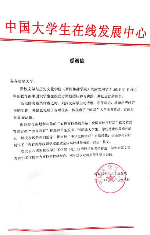 近日,学校收到教育部中国大学生在线发来的感谢信,感谢beats365校网通站学生刘露文在中国大学生官方微信团队实习实践期间的辛勤工作,感谢学生工作部(学生处)校网通站指导教师林浩等对中国大学生在线工作的大力支持和积极配合。