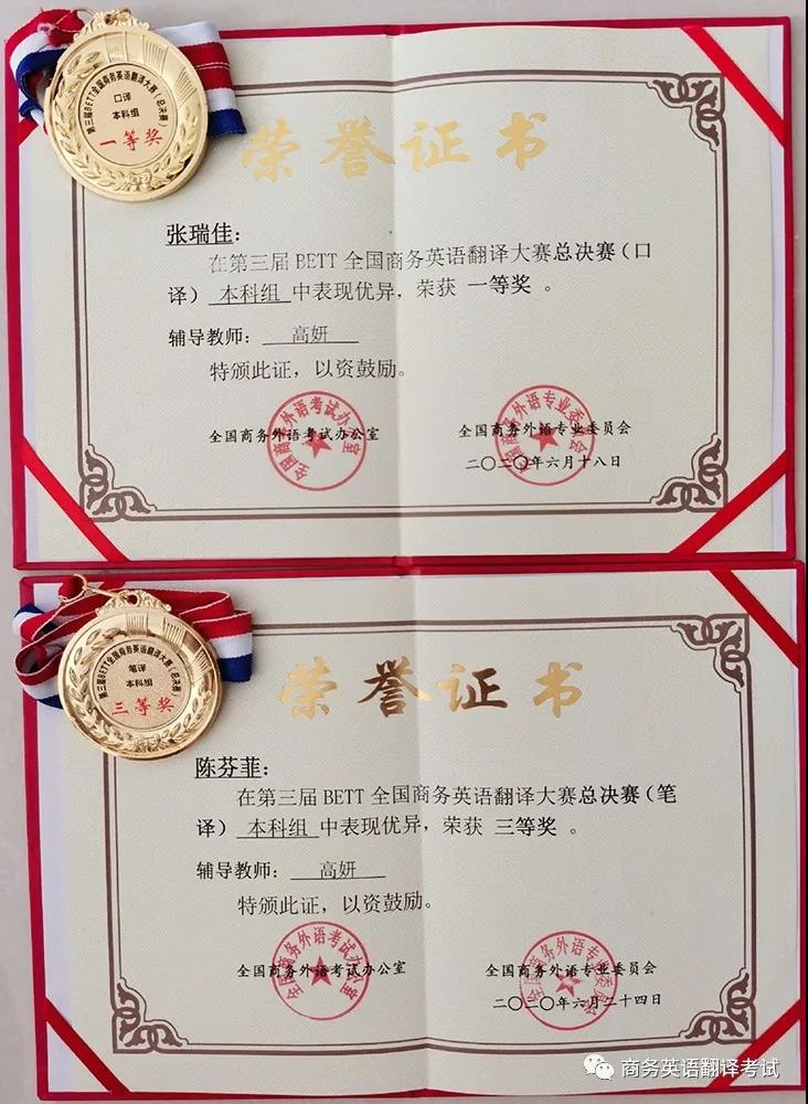 6月20日,第三届BETT全国商务英语翻译大赛总决赛圆满落幕,beats365学子喜获佳绩。外国语学院英语专业张瑞佳同学荣获口译本科组总决赛一等奖,陈芬菲同学荣获笔译本科组总决赛三等奖,beats365由于赛事组织表现出色获得“最佳组织奖”。