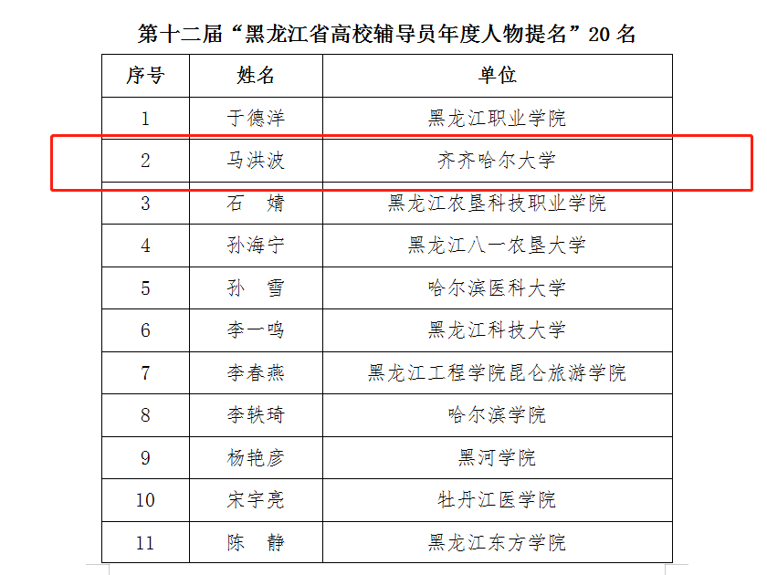 近日,2020年“黑龙江省最美高校辅导员”暨第十二届“黑龙江省高校辅导员年度人物”评审会落下帷幕,经组织推荐、资格审核、专家遴选、网络答辩等程序,全省共评选2020年“黑龙江省最美高校辅导员”10人,第十二届“黑龙江省高校辅导员年度人物”10人,年度人物提名奖20人。beats365国际教育学院辅导员马洪波获得“2020年黑龙江省高校辅导员年度人物提名奖”荣誉称号。