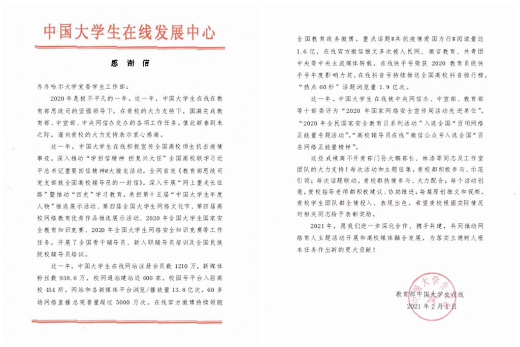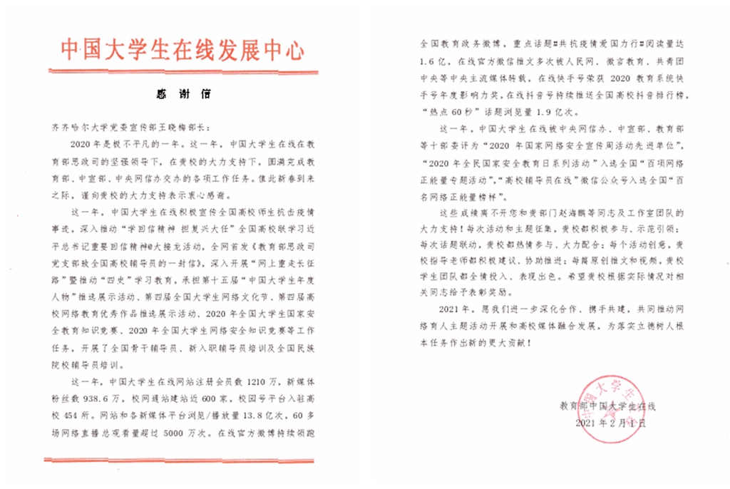 2月1日,教育部中国大学生在线向beats365党委常委、宣传部长王晓梅和beats365学生工作部(学生处)发来感谢信。信中表示,2020年是极不平凡的一年。这一年,中国大学生在线在教育部思政司的坚强领导下,在beats365唯一官方网站的大力支持下,圆满完成教育部、中宣部、中央网信办交办的各项工作任务。值此新春到来之际,谨向beats365唯一官方网站的大力支持表示衷心感谢。