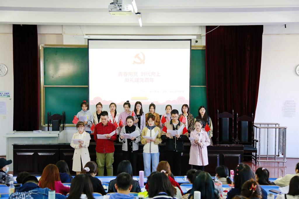 为了使党史学习教育更好地融入思政课,马克思主义学院积极探索有效载体与可行模式,在已开设的思政课中,教师结合专业、结合课堂实际组织学生以个体通读、群体朗读、集体诵读的方式围绕讴歌建党百年这一主题进行课堂融入,采取课前5分钟讲党史、课上经典诵读咏党史、课后学生分享传党史的方式在全校思政课堂扎实开展党史学习教育。
