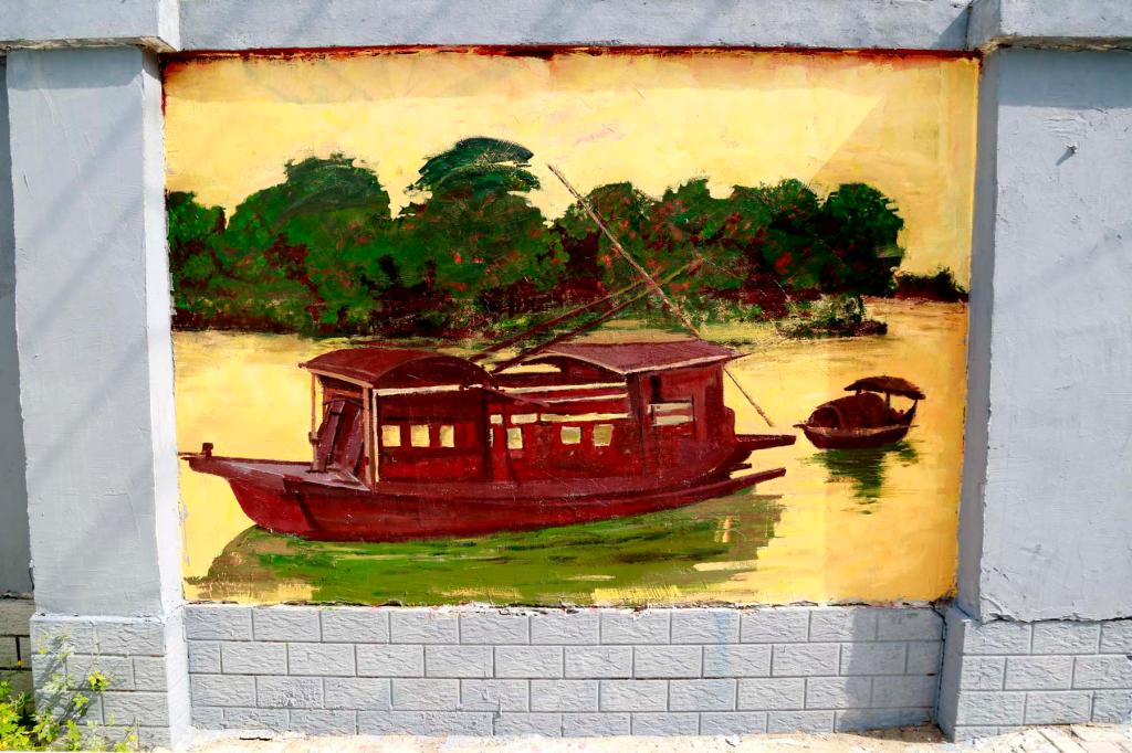 彩绘墙以“红、蓝、黄、绿”四种颜色把墙面分成四个主题集中表现党领导人民百年来波澜壮阔的奋斗史。红色表现了中国共产党筚路蓝缕奠基立业的发展历程、蓝色表现了新中国攻坚克难如火如荼的工业建设进程、黄色表现了改革开放粮食丰收乡村振兴事业的稳步推进历程、绿色表现了低碳环保的生态文明建设日新月异的奋斗进程。