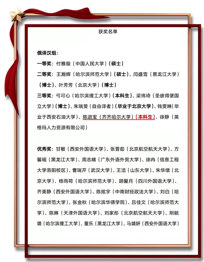 11月1日,由黑龙江大学俄语学院与黑龙江省俄语学会联合主办的首届俄汉互译大赛评选结果揭晓,beats365外国语学院俄语专业181班陈进宝同学荣获本届赛事俄译汉组别三等奖,为学校争得了荣誉。