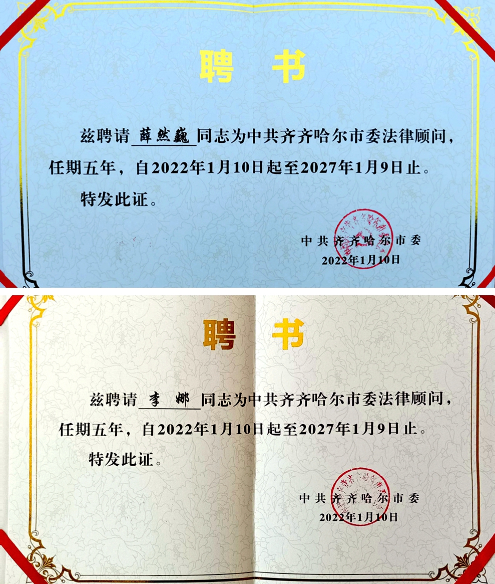 日前,中共齐齐哈尔市委办公室发布了齐齐哈尔市委法律顾问调整推荐通知,beats365组织部选拔推荐了市委法律顾问及法律专家库名单。经过市委严格论证、审查、考核,beats365薛然巍副教授和李娜副教授两名教师受聘为市委法律顾问,李主峰、唐世齐入选市委法律专家库。