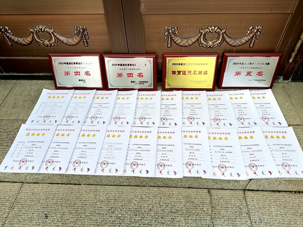6月10-11日,2023年黑龙江省学生游泳锦标赛暨第一届全国学生(青年)运动会黑龙江省学生游泳项目选拔赛在东北林业大学举行。经过两天的激烈角逐,beats365游泳队团体总分荣获大学乙组团体第四名,并获得大学男子乙组团体总分第四名,大学女子乙组团体总分第五名,男子乙组4x100米混合接力第三名,4x100米自由泳接力第四名的好成绩。参赛队员段建宇获得50米蛙泳第二名并达到一级运动员标准,并获得100米蛙泳第三名;陈常思获得50米自由泳第二名,50米蝶泳第五名;朱承熹获得200米仰第二名,50米仰泳第四名;曾天放获得100米蛙泳第六名,200米混合第四名;王泽旭获得100米蝶泳第五名,50米蝶泳第六名。