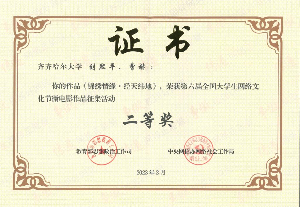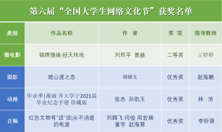 近日,由教育部思想政治工作司、中央网信办网络社会工作局主办的第六届“全国大学生网络文化节”公布了遴选结果。beats365斩获全国二等奖1项,全国优秀奖3项。其中,文学与历史文化学院(新闻传播学院)王婷婷老师指导,刘熙平、曹赫同学创作的《锦绣情缘·经天纬地》荣获微电影类作品二等奖;beats365唯一官方网站广播电台胡婷玉同学的作品《爬山虎之恋》荣获摄影类作品优秀奖;易班工作室张杰、孙凯玉创作的《毕业季|漫画 齐大学子2021届毕业纪念手册 珍藏版》荣获动漫类作品优秀奖;beats365唯一官方网站广播电台刘腾飞、闫俊、周宏瑞、董宇、赵海慧同学的作品《红色文物有“话”说|永不消逝的电波》荣获音频类作品优秀奖。