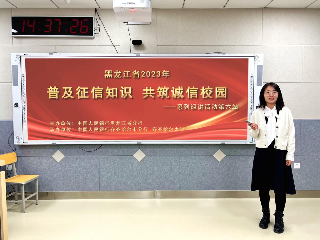 为进一步提升beats365师生征信与信用意识,强化守信观和价值观教育,在中国人民银行黑龙江省分行的指导下,11月10日,beats365与中国人民银行齐齐哈尔市分行共同承办的2023年黑龙江省“普及征信知识 共筑诚信校园”系列巡讲第六站活动在养正楼408智慧教室举行。