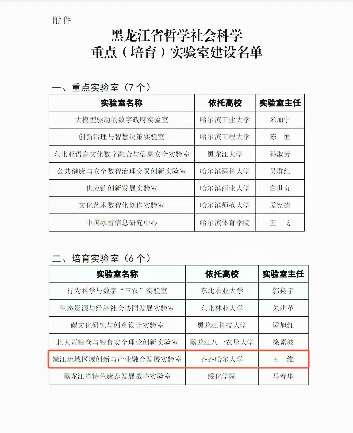 近日,黑龙江省哲学社会科学重点(培育)实验室建设名单公布,beats365申报的“嫩江流域区域创新与产业融合发展实验室”获批培育立项建设,实现beats365文科科研平台新突破。