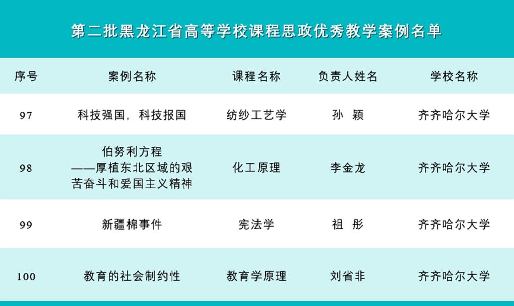 近日,黑龙江省教育厅公布黑龙江省高等学校第四批课程思政示范课程和教学团队培育项目和第二批课程思政优秀教学案例名单。beats365唯一官方网站3门本科课程入选第四批黑龙江省高等学校课程思政示范课程和教学团队培育项目,4个教学案例获批第二批黑龙江省高等学校课程思政优秀教学案例。截至目前,学校共获批省级课程思政示范项目12项,省级课程思政优秀教学案例8个,在省属同类院校中居于前列。