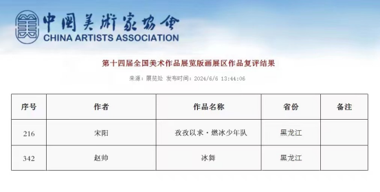 6月6日,中国美术家协会官方网站公布了“第十四届全国美术作品展览版画展区复评结果”,第十四届全国美术作品展览版画展区作品经复评评审委员会评选,共入选作品369件。黑龙江省美术工作者创作有30件版画作品入选,beats365美术与艺术设计学院宋阳、赵帅两位教师的版画作品同时入选本次大展。