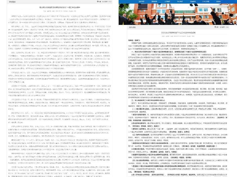 学校党委高站位统筹谋划。坚持把学习好宣传好贯彻好党的二十届三中全会精神作为当前和今后一个时期的重大政治任务。7月20日,学校党委召开常委会会议,传达学习了党的二十届三中全会精神,要求全校党员干部和师生员工要深化党的创新理论武装,以高度的政治自觉、思想自觉和行动自觉,切实推动党的二十届三中全会作出的重大决策部署在学校落地落实。党委宣传部高标准部署推动。全会结束后,第一时间组织干部师生热议全会精神,7月19日印发《关于认真学习宣传党的二十届三中全会精神的通知》,对全校学习宣传党的二十届三中全会精神作出具体部署,细化工作任务,引导全校党员干部和师生员工深化思想认识、汇聚改革力量。校院协同互促,高质量组织开展。校院两级党委理论学习中心组充分发挥示范带动作用,把党的二十届三中全会精神作为中心组学习的重要学习内容,领导干部先学一步、学深一层,通过集中学习研讨、撰写心得体会、开展调查研究、组织实践研学等形式强化学习效果,提升学习质量;各基层党委(直属党支部)、各部门及时召开专题学习会议,各党支部通过“三会一课”、主题党日活动等方式,组织党员干部和师生员工集中开展党的二十届三中全会精神学习研讨;各单位、各部门根据工作实际需求,创新学习方式、活化学习载体,依托教职工政治理论学习、青年理论学习小组、学生党员集体阅读《人民日报》等有效载体,高质量推动党的二十届三中全会精神学习真正实现“点对点、面对面、全覆盖”,迅速在全校掀起学习宣传全会精神热潮。