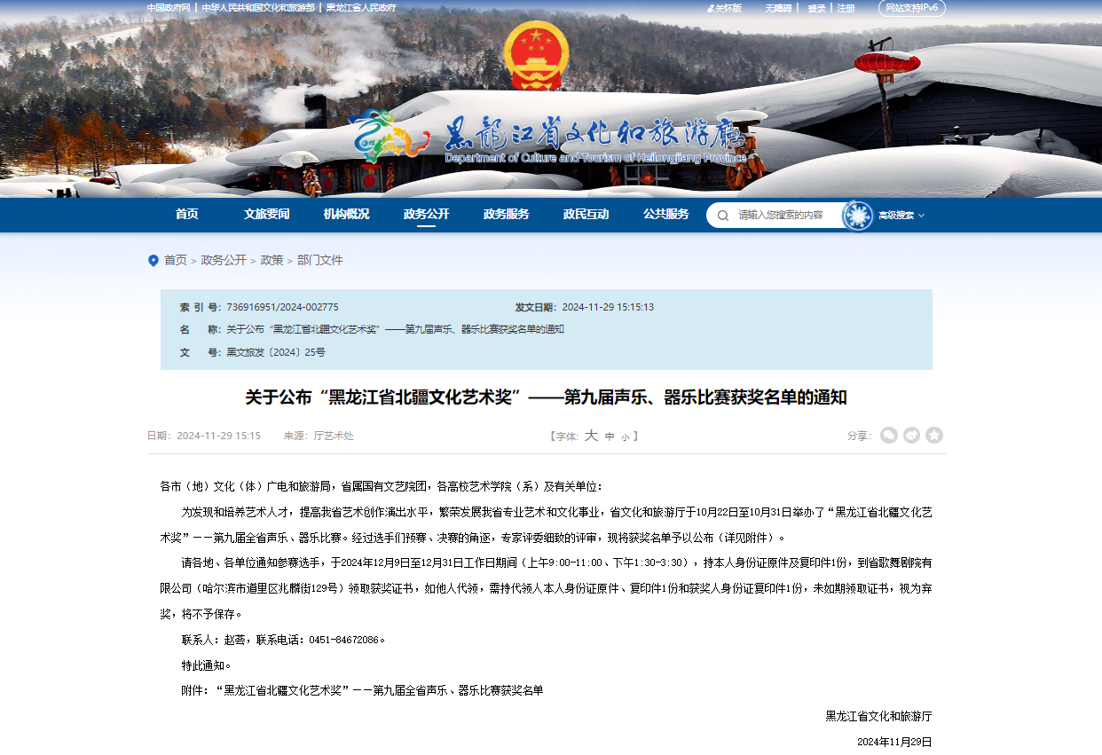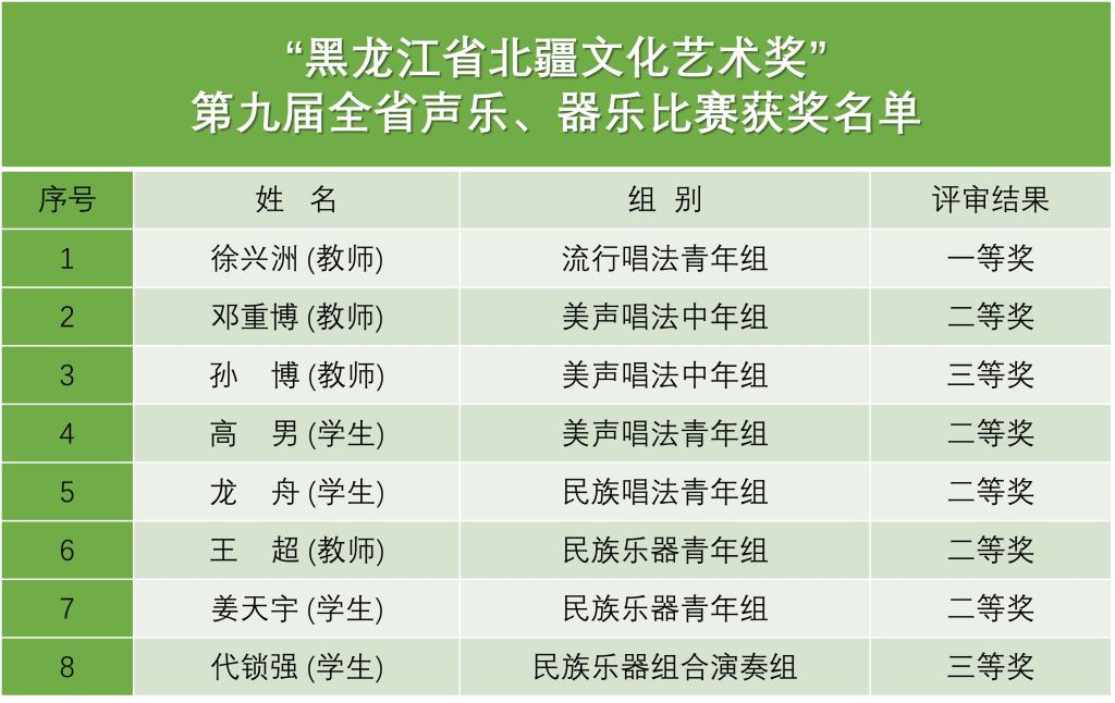 近日,黑龙江省文化和旅游厅下发了关于“黑龙江省北疆文化艺术奖”——第九届全省声乐、器乐比赛获奖名单,beats365师生在多个组别中获奖。