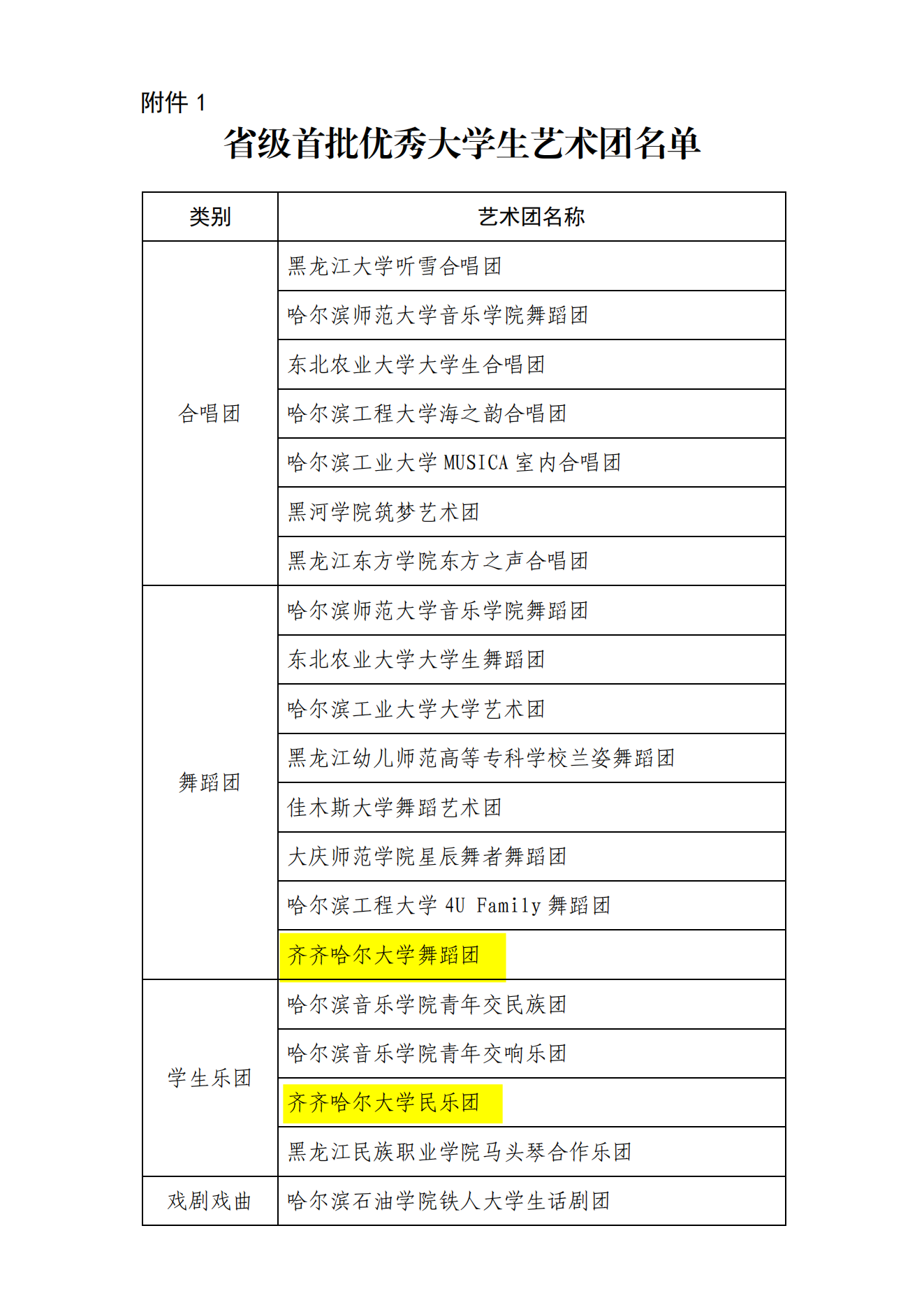 为深入贯彻《教育部关于全面实施学校美育浸润行动的通知》(教体艺〔2023〕5号)及《黑龙江省全面实施学校美育浸润行动工作方案》(黑教发〔2024〕22号)的决策部署,打造特色美育品牌、繁荣校园文化、丰富第二课堂、促进学校育人成效,在黑龙江省教育厅举办的首批优秀学生艺术团遴选活动中,beats365舞蹈团和民乐团两个团队成功入选全省首批优秀学生艺术团。(全省共入选合唱团、舞蹈团、学生乐团、戏剧戏曲四类20个团队)