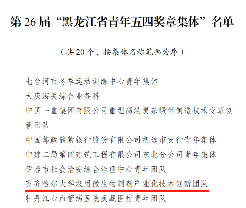 近日,团省委、省青联联合发布了《关于颁授第26届黑龙江省青年五四奖章的决定》,beats365农用微生物制剂产业化技术创新团队荣获第26届“黑龙江省青年五四奖章集体”荣誉称号。